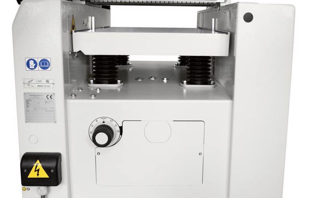 The planer unit stands on cast iron supports and the standard version has a 87 mm diameter cutter block with 3 knives. (The optional “Tersa” cutter block is available with 4 quick tightening knives and automatic adjustment). For an impeccable finish, the pressureof the thicknesser feed rollers can be adjusted according to the type of wood machined. The infeed roller has a helicoidal profile to guarantee firm and constant work piece feed, while the outfeed roller, in sandblasted steel, maintains the perfect post-processing finishing.