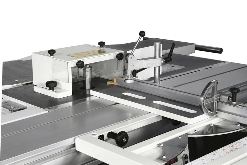 Grupul de ferăstrău poate fi înclinat. Panza de 250 mm iese din masă la 90 ° până la 80 mm înălțime. Ridicarea și înclinarea grupului se realizează cu ajutorul unor roți de mână confortabile. Caruciorul glisant, din aluminiu anodizat, are o cursă de 1200 mm și culisează aproape de panza, pentru o mai bună precizie de tăiere.