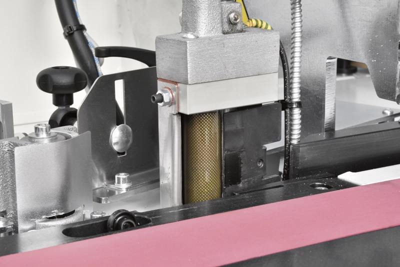 Tăierea pneumatică a capătului piesei pentru tăierea cantului din față și din spate la 90 °. Posibilitatea excluderii grupului prin intermediul PLC. Structura din oțel de înaltă rigiditate și stabilitatel