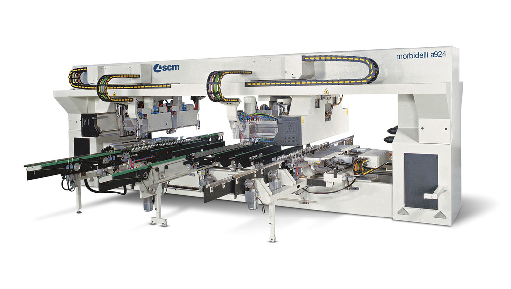 Mașină de gaurit automată în celulă sau linie integrată pentru producția de elemente de mobilier, larg configurabilă și orientată către orice tip de industrie.
